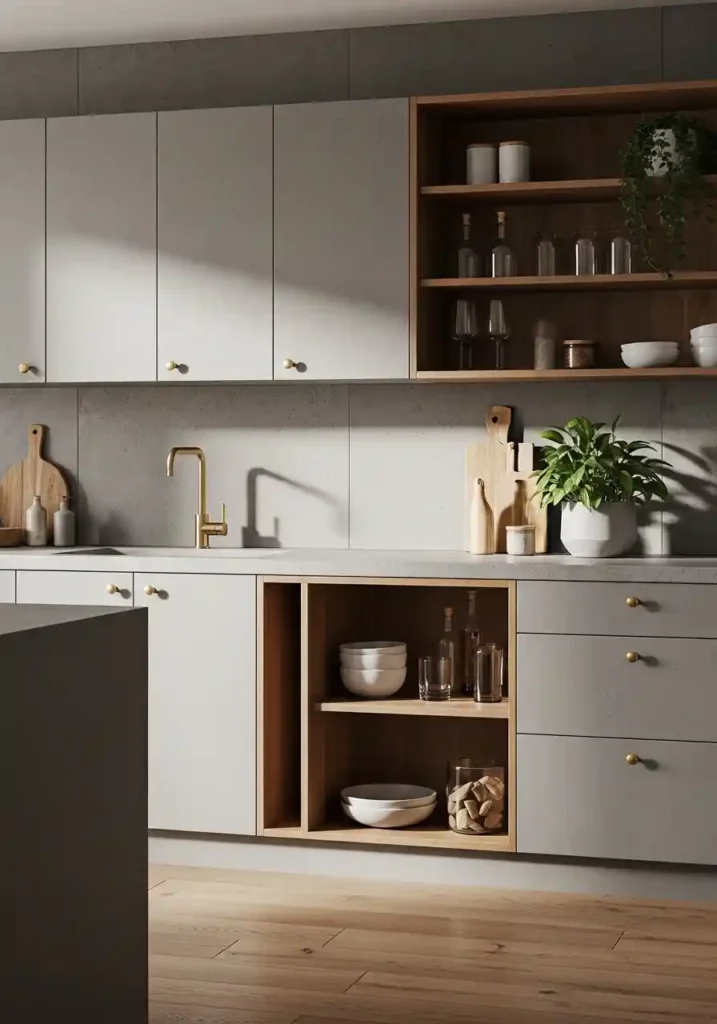 A concrete and timber kitchen cabinet combination — where smooth honed concrete panel cabinet doors create the most architecturally honest and the most genuinely raw modern kitchen surface available, complemented by warm natural timber open shelving sections that provide essential organic warmth within the raw concrete composition — creates the single most materially authentic and the most architecturally ambitious modern kitchen design available for homes where the genuine beauty of honest, undecorated raw materials is the most deeply felt and the most completely committed design value!