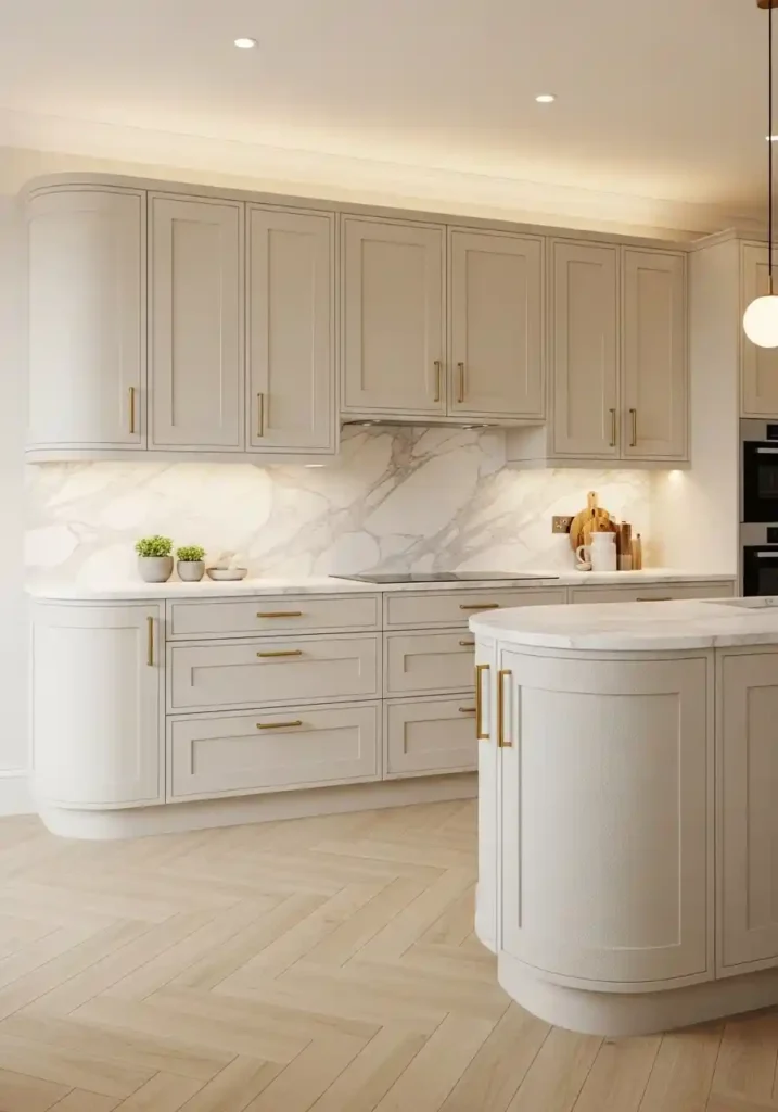 The most magnificently beautiful curved cabinet modern kitchens are those where the curves are genuinely continuous and genuinely complete rather than applied as token gestures of organic form — base cabinet corner sections with a genuine radius of at least 30cm creating substantial visual softness at every corner transition. Curved island base following the same radius creating beautiful compositional unity between island and perimeter cabinetry. Warm ivory or cream cabinet finish honoring the organic quality of curved form with appropriately soft material warmth. Thick marble countertop following the curved profiles. Warm floor. Soft recessed lighting. The curved kitchen is organic architecture made completely beautiful.