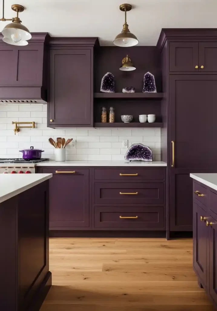 The most magnificently beautiful aubergine modern kitchen cabinet installations are those where the specific aubergine tone is genuinely warm and genuinely plum-toned rather than cool or blue-adjacent — the warmth within the deep purple creating an atmosphere of genuine richness and genuine beauty rather than the somewhat oppressive quality of cool purple kitchen cabinets! Warm polished gold hardware creating the most brilliantly beautiful metallic contrast. Warm white quartz countertop. White handmade tile backsplash. Warm wide plank oak floor. Amethyst crystal objects on open shelving referencing the purple palette with genuine geological beauty. The aubergine kitchen creates complete unexpected magnificence.