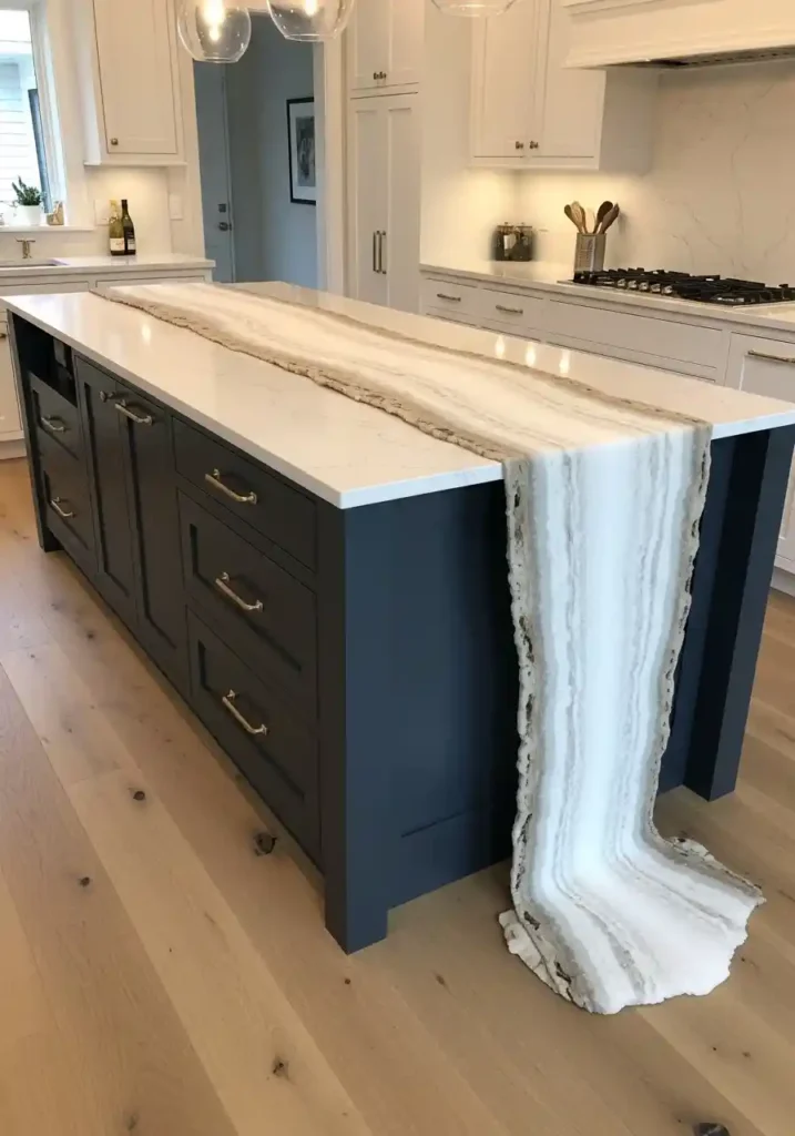 2. The Dramatic Waterfall Island Cabinet: Where the Countertop Becomes Part of the Cabinetry