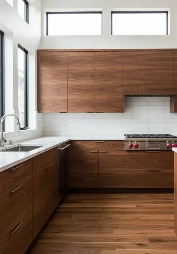 The most magnificently beautiful full walnut modern kitchen installations are those where every design decision is made in service of the walnut’s extraordinary natural grain beauty — horizontal grain orientation on flat panel doors creating the most beautifully flowing and the most compositionally resolved natural wood cabinet surface. White marble countertop creating the most brilliantly beautiful and the most genuinely luxurious contrast. White tile backsplash maintaining cooking zone luminosity. Warm walnut floor creating extraordinary rich material continuity. Large windows ensuring abundant natural light reveals the walnut’s full depth and beauty.