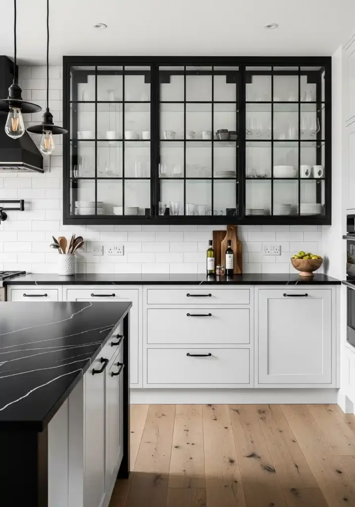 The most magnificently beautiful steel and glass modern kitchen cabinets are those where the steel frame profiles are genuinely slim and genuinely well-fabricated — thick or poorly formed steel frames undermine the industrial precision that makes this cabinet design so impressive! Black powder-coated steel in flat or satin finish. Clear glass revealing beautifully organized ceramic and glass collections within. Matte white lower cabinets creating material contrast and brightness below the industrial upper section. Black quartz countertop continuing the industrial material palette. Warm oak floors providing essential organic warmth. Edison bulb pendants completing the authentic industrial modernist kitchen.