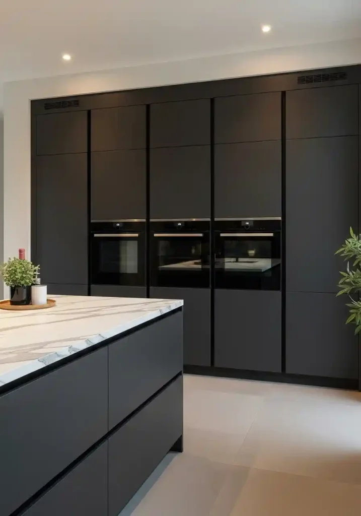 The most magnificently beautiful integrated handleless modern kitchens are those where the J-pull profile precision and the cabinet door alignment are executed with the most exacting technical standards — because the complete absence of decorative hardware means that every shadow line, every reveal dimension, and every door alignment is immediately and completely visible without visual distraction! Deep matte charcoal creates the most dramatically sophisticated result. White Carrara marble countertop provides essential material contrast. Integrated appliances behind matching panels create absolute seamless visual unity. Warm recessed lighting creates soft, even architectural illumination. The handleless kitchen is architecture at its purest.