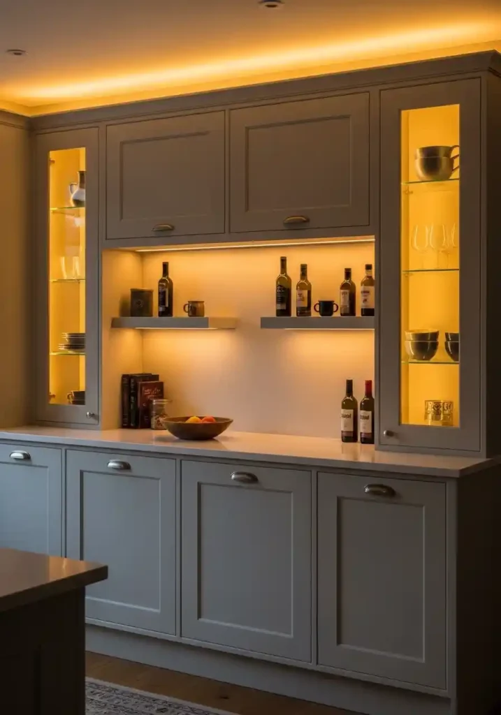 A comprehensive integrated cabinet lighting system — where warm LED strips are designed and installed within dedicated channels beneath upper cabinets, within open shelf sections, above floor-to-ceiling cabinet runs, and within glass-fronted display cabinets, creating a complete architectural lighting composition that emanates from within the cabinetry itself rather than being imposed from external ceiling fixtures — creates the single most atmospherically beautiful and the most genuinely professionally designed kitchen lighting experience available in any modern home!
