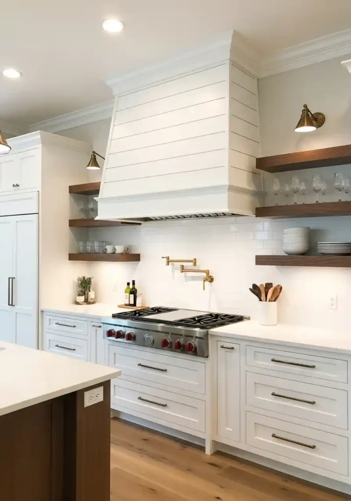 The most magnificently beautiful custom range hood modern kitchens are those where the hood design is genuinely integrated with the surrounding cabinet composition — custom shiplap timber range hood flanked by matching white Shaker cabinets and open walnut shelves creating the most beautifully complete and the most compositionally resolved cooking alcove available. A plaster hood creating smooth organic sculptural drama. A copper hood developing extraordinary natural patina. A brass hood creating warm metallic brilliance. Each custom hood material creates a kitchen focal point of extraordinary architectural ambition and genuine personal design conviction.