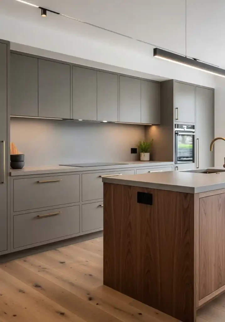 A microcement and natural wood combination in modern kitchen cabinetry — where the raw, slightly textured, organically variable surface quality of genuine microcement finish on the primary cabinet run creates the most honest and the most architecturally sophisticated cabinet surface available, complemented by warm natural walnut veneer island cabinetry that provides essential organic warmth against the industrial grey — creates the single most materially sophisticated and the most genuinely architecturally brave modern kitchen available for homes where raw honest material beauty is the highest possible design priority!