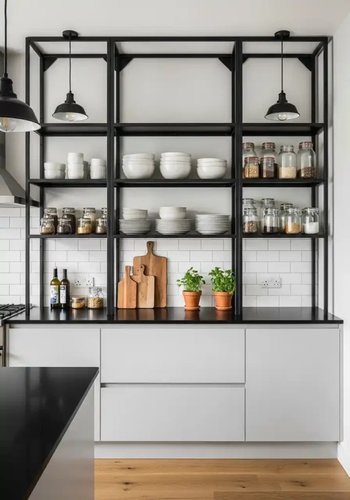 The most magnificently beautiful open frame modern kitchen cabinet installations are those where the frame material is of genuinely excellent quality and genuinely precise fabrication — black powder-coated steel with consistent frame dimensions and precise welded or bolted joints creating the most authentic and the most beautiful industrial structural expression! Beautiful organized ceramic and glass collections on the open shelves. Fresh herb plants adding botanical warmth. Matte white lower cabinets providing essential concealed storage. Black quartz countertop continuing the industrial material palette. Warm oak floors providing organic warmth. The open frame kitchen is industrially magnificent.