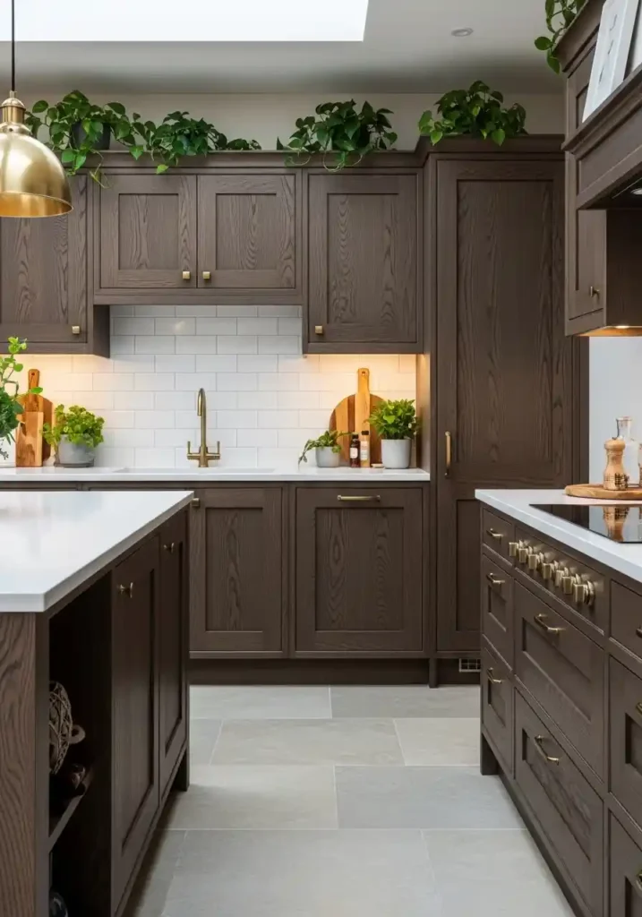 The most magnificently beautiful smoked oak modern kitchen cabinets are those where the specific fuming or staining process creates genuine warm grey-brown tones rather than cold grey — the warmth within the smoked oak’s color creating a kitchen atmosphere of genuine organic warmth and complete material sophistication! Flat panel doors allowing maximum smoked grain visibility. Slim integrated brushed brass handles complementing the warm grey-brown tones with harmonious metallic warmth. White quartz countertop providing luminous contrast. Warm grey stone-look floor tiles complementing the smoked oak palette. Abundant green plants creating vivid botanical contrast. The smoked oak modern kitchen is beautifully sophisticated.