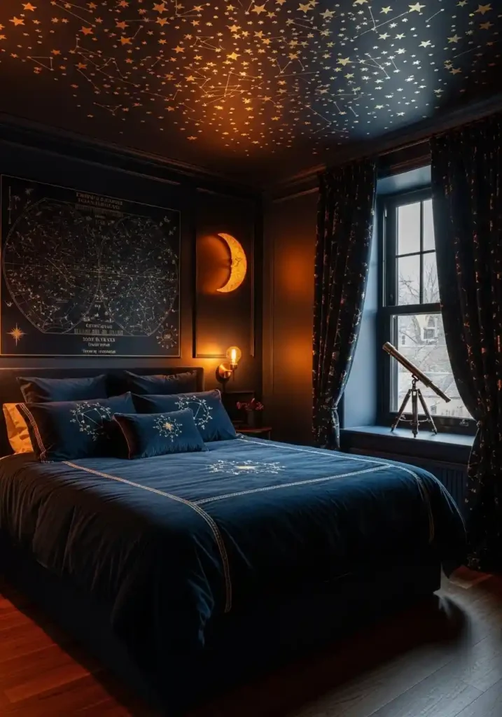 A celestial dark moody bedroom — where deep midnight navy walls are hand-decorated with gold leaf stars creating a genuinely immersive private night sky of such extraordinary beauty and such genuine celestial accuracy that every night spent within it feels like sleeping beneath the most perfect and the most personally significant star field ever observed — creates the most magically atmospheric and the most genuinely wonder-inspiring moody bedroom available for personalities who find their deepest resonance with the infinite beauty and the extraordinary scale of the actual universe beyond the earth’s atmosphere!