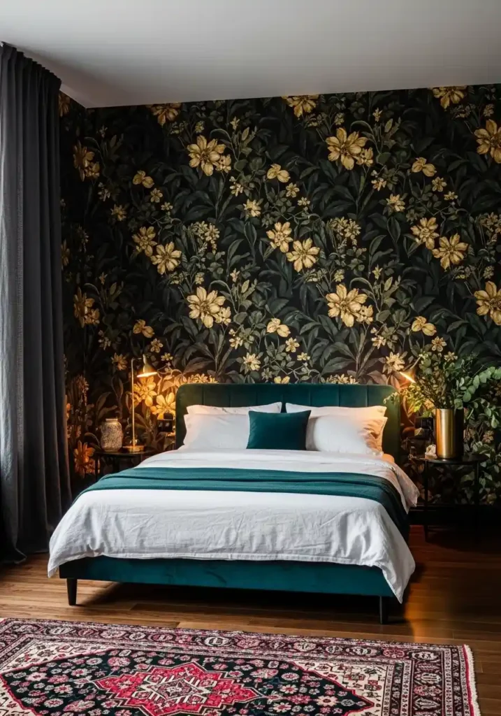 Dark botanical wallpaper in a moody bedroom — where a midnight black or deep charcoal ground carries the most dramatically scaled and the most magnificently illustrated botanical motifs in gold, deep green, and warm coral — creates the single most artistically extraordinary and the most completely immersive moody bedroom environment available, because pattern on a dark ground creates a visual experience of such extraordinary depth and such completely beautiful complexity that the bedroom walls become genuine works of decorative art that reward sustained, close attention with continuously revealed new beauty and depth!
