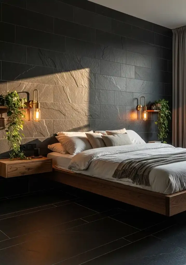 A dark natural stone feature wall in the master bedroom — where large format charcoal stone-effect or genuine stone tiles cover the full wall behind the bed in a material application more typically associated with luxury spa design — creates the single most architecturally sophisticated and the most genuinely unexpected moody bedroom feature available, transforming the bed wall from a simple painted or papered surface into a wall of extraordinary material depth, genuine geological texture, and complete three-dimensional richness that makes the entire bedroom feel more architecturally significant and more genuinely luxurious!
