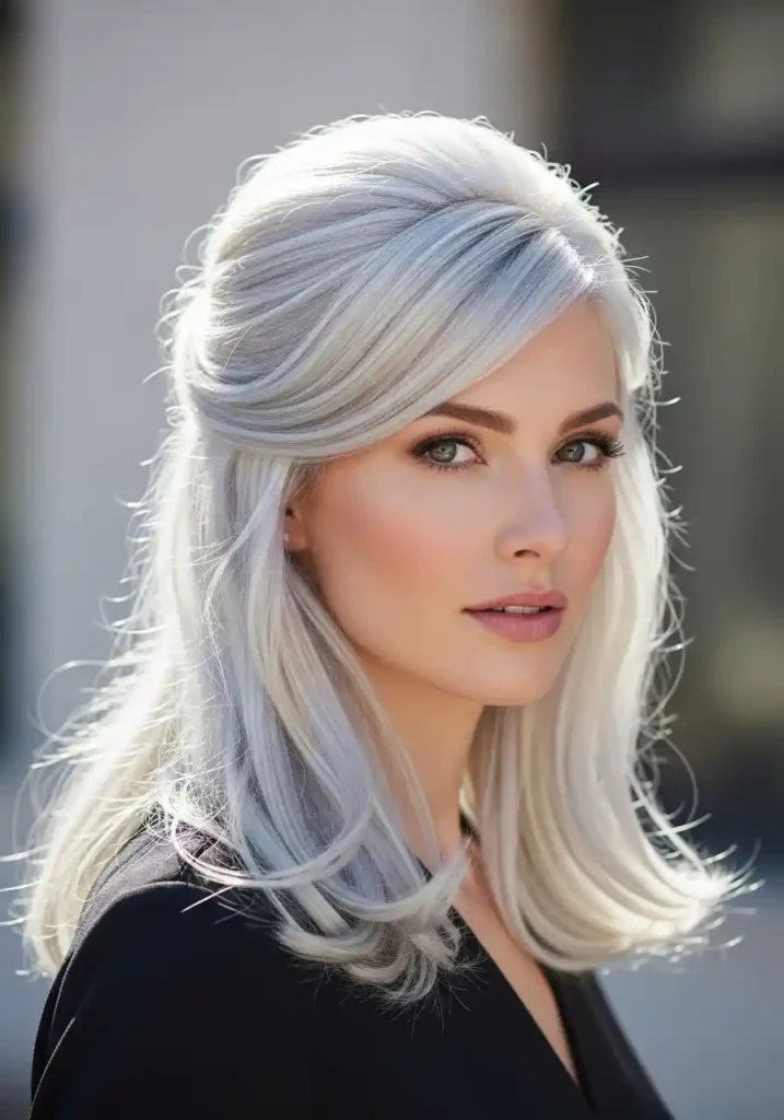 The half up style also performs a specific and deeply flattering function for platinum blonde hair by bringing the most concentrated sections of the extremely bright color directly to the crown level where they create the most significant complexion-brightening and face-illuminating effect, with the gathered platinum at the crown reflecting brilliant, cool light downward onto the face from above in a way that mimics the most flattering possible natural lighting from overhead and creates a luminous, glowing impression of facial beauty that no other styling arrangement of the same platinum hair quite replicates with the same immediacy and consistent flattering power.