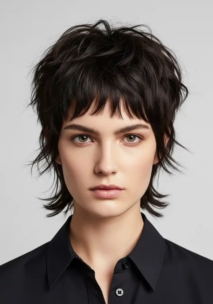 Micro bangs on a shag cut create an immediately striking, fashion-forward combination that feels genuinely fearless — this is the version that stops people in the street. The key is that the micro bangs should be deliberately wispy and slightly imperfect rather than blunt and heavy, because the wispy quality connects them visually to the shag’s overall texture and makes the whole look feel cohesive rather than like two separate decisions on the same head. This combination works particularly powerfully on dark hair where the contrast between the short bangs and the textured length below creates maximum visual drama.