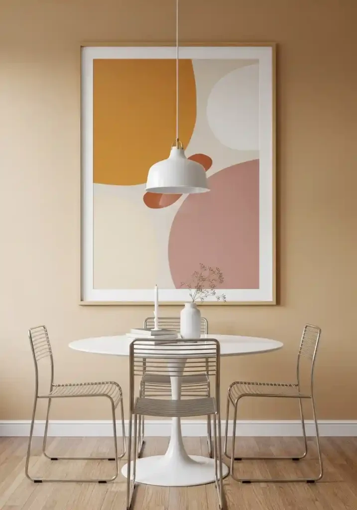 Size the artwork relative to the wall rather than relative to the table — a piece that occupies sixty to seventy percent of the wall’s width creates the most confident and most specifically impactful focal point. The instinct to choose smaller artwork for a small space often undermines the potential visual impact of the compact dining area. Oversized artwork in a small space creates a specific, editorial, magazine-worthy quality that correctly scaled or undersized artwork never achieves. One large frame makes a small room feel designed and specifically beautiful.