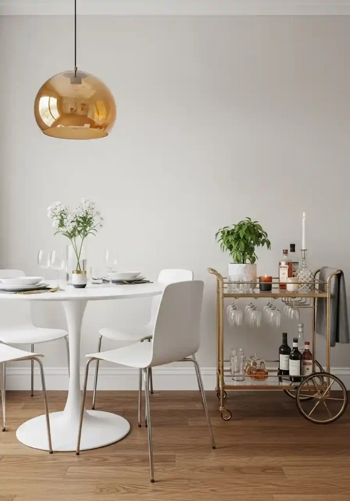 Choose a bar cart in a finish that complements the dining table and chairs — a warm brass cart with a glass table, a black metal cart with a dark walnut table, or a natural wood cart with a light oak table creates the most cohesive and most specifically stylish visual pairing. Style the cart with intentional curation rather than as a catchall storage — organized glassware, one or two attractive bottles, a small plant, and a candle creates a specifically beautiful cart arrangement that adds aesthetic warmth and sophistication to the compact dining area’s overall design character.