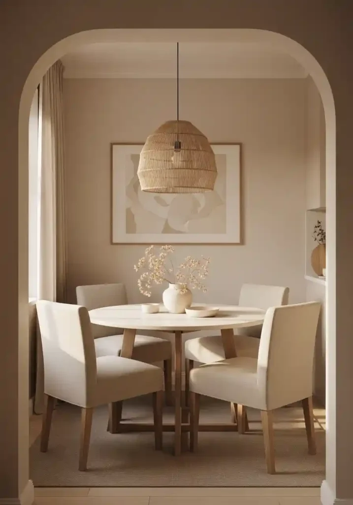 The tonal unity of a monochromatic scheme reduces the visual complexity that small spaces are most vulnerable to — when the eye encounters multiple competing material colors in a compact room, the space feels more crowded and less coherent than its actual dimensions warrant. Introduce textural variety within the monochromatic palette through linen upholstery, woven pendant materials, ceramic objects, and natural fiber rugs, allowing the material texture rather than color contrast to create the visual interest that makes the dining area feel warmly layered and genuinely beautiful.