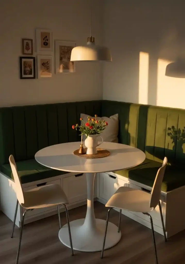 The most valuable practical feature of a built-in banquette is the storage opportunity within its base structure. Drawers or lift-top seat compartments beneath the cushioned surface create substantial hidden storage capacity for table linens, extra serving pieces, and kitchen overflow — addressing the storage scarcity that characterizes most compact living situations. Upholster in a washable performance fabric that suits the dining area’s color story, and install the banquette with a cushion thickness of approximately eight to ten centimeters for the most comfortable dining height relative to the table surface.