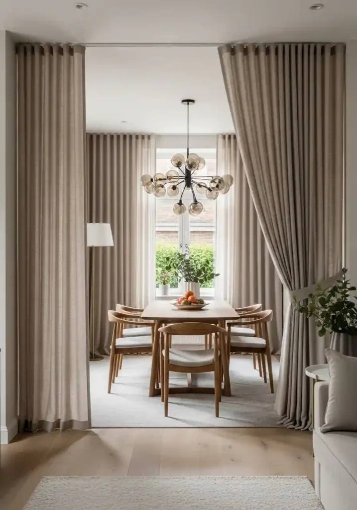 Install the curtain track as close to the ceiling as possible — ideally directly against the ceiling rather than on a recessed track — to maximize the floor-to-ceiling curtain drop’s height-elongating visual effect and create the most dramatic and the most architecturally resolved curtain divider. Choose a heavyweight linen, velvet, or woven fabric in a tone that works with both the dining area and the adjacent living space’s color palette, since the curtains are visible from both sides and must be beautiful from both directions.