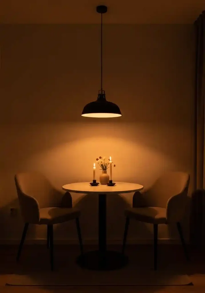 Supplement the dimmed pendant with candles at dinner — even two or three simple candles on the dining table create a quality of warm, flickering intimacy that makes the most modest compact dining area feel genuinely romantic and genuinely hospitable. The combination of dimmed ambient pendant and candlelight creates the atmospheric magic that makes dinner guests feel specifically welcomed and the small space feel specifically, deliberately beautiful rather than apologetically compact. A simple plug-in smart dimmer adapter requires no electrical work and creates an immediate transformation.