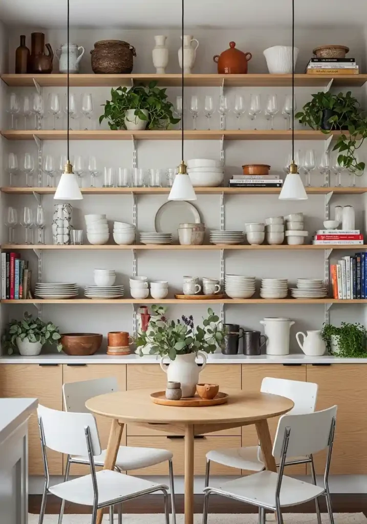 Style floating shelves in a curated, deliberately organized way rather than filling them with functional overflow — grouping similar objects by color, material, or type, maintaining clear visual breathing space between arrangements, and mixing practical serving pieces with plants and decorative objects creates a dining backdrop of genuine, specific beauty. Keep the most frequently used items on the lower accessible shelves and reserve higher shelves for seasonal pieces and decorative objects that add warmth without requiring daily access.