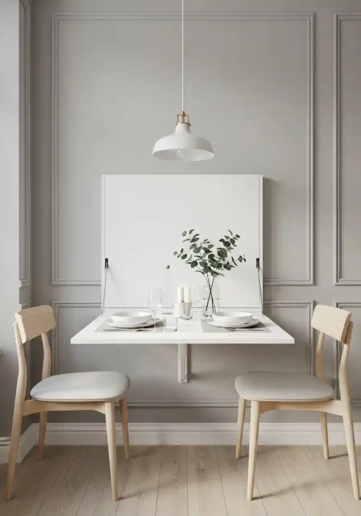 Choose a model with an integrated bracket system that holds the table surface completely stable and horizontal when extended — unstable fold-down tables create an unpleasant dining experience that undermines the investment. Pair with two lightweight chairs that hang from wall-mounted hooks on either side of the table when not deployed, or choose slim folding chairs that slide under an adjacent console. A pendant light hung at the appropriate height above the intended table position completes the dining zone architecture even when the table is folded away.