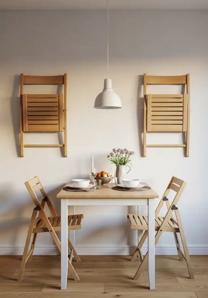 Maintaining only the minimum everyday seating in deployed position and storing additional chairs flat or folded when not needed keeps a compact dining area visually open and physically comfortable on the majority of days when full-capacity seating is not required. High-quality folding chairs in natural wood or powder-coated metal that are genuinely beautiful as well as functional can hang from wall hooks as intentional design objects between uses, eliminating the visual problem of obviously stored furniture in a compact space.