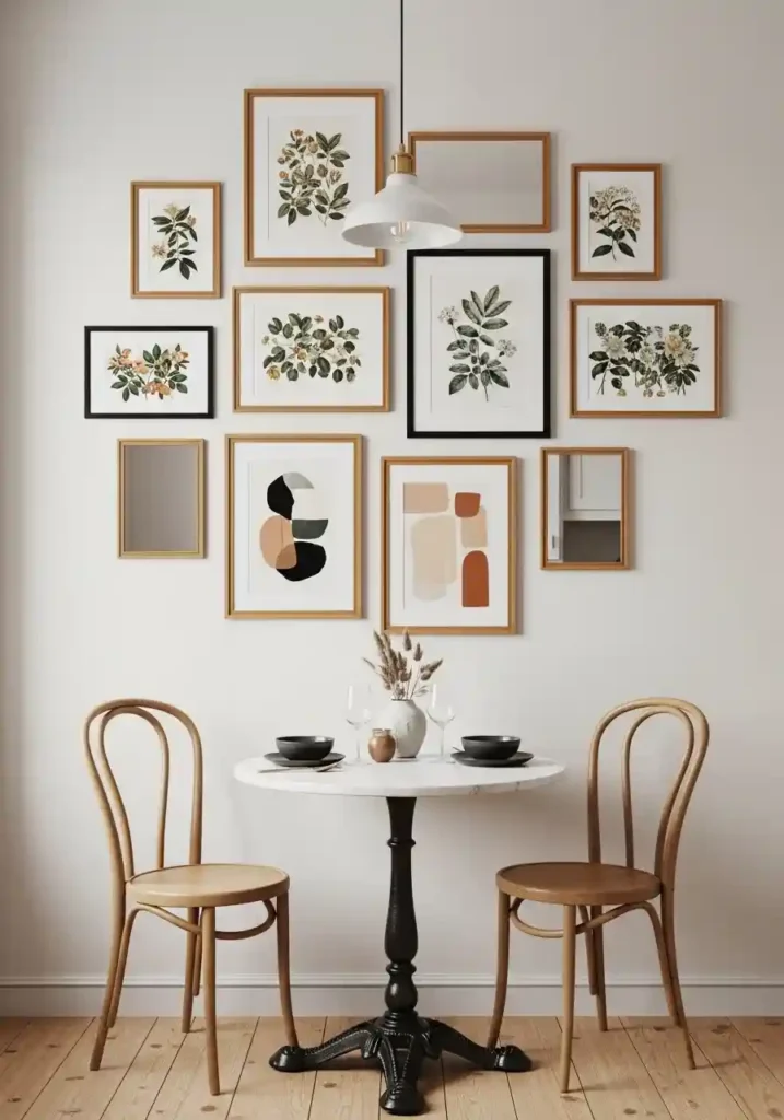 A gallery wall installed above and behind the dining table creates a visual focal point that gives the compact dining area its own distinct backdrop and its own specific design identity — the gallery wall communicates that this corner of the home has been specifically considered and specifically designed, creating the psychological impression of a dedicated dining space even when the physical dimensions are genuinely minimal. The visual complexity and warmth of a gallery wall creates the perception of a more spacious, more specifically designed environment.