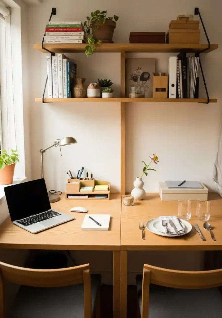The key to making a dual-use dining and work table most functional is establishing clear visual rituals for transitioning between uses — a specific small container that holds work supplies and can be set aside at mealtimes, a desk lamp that signals work mode, and a dinner setup that signals meal time. These transitional rituals make the multipurpose table feel deliberately, intentionally used for two specific purposes rather than perpetually mid-use and visually chaotic. Floating shelves above the table can store both dining and work materials in a single organized surface.