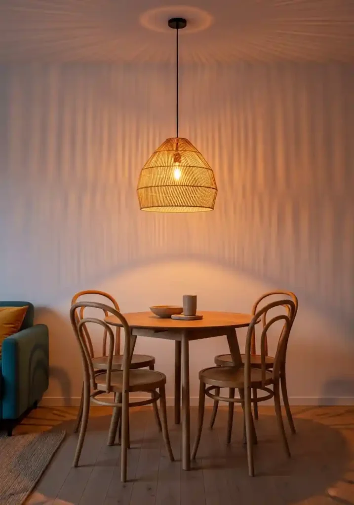 Choose a pendant whose diameter is approximately half the table’s diameter for the most confident and most aesthetically proportional relationship. In compact spaces, a slightly generously scaled pendant creates more atmospheric warmth and more specific design character than a cautiously undersized fixture, making the small dining area feel more deliberately designed and more specifically beautiful. Install the pendant at seventy to eighty centimeters above the table surface — lower than most people’s instinct suggests — for the most intimate and most flattering dining atmosphere.