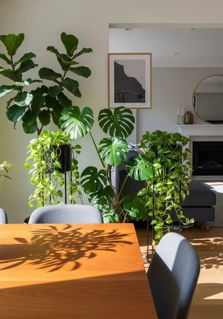 A curated arrangement of tall floor plants positioned at the boundary between the dining area and the adjacent living zone creates a natural, organic zone divider that adds plant-specific benefits — improved air quality, acoustic softening, and genuine living beauty — that no inanimate divider can replicate. The plants create visual separation through their physical presence while maintaining the open, airy quality of the combined space because their branching, organic forms allow light and sight lines to pass between them rather than blocking the space as a solid wall would.
