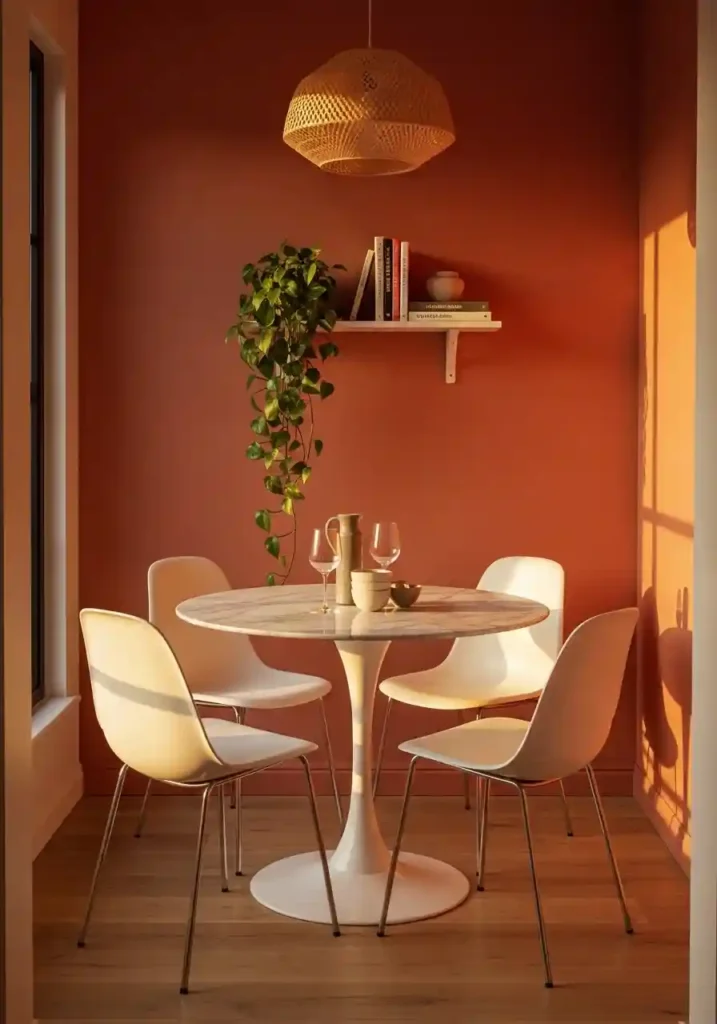 A consistent tone-on-tone palette — where walls, furniture, and textiles share the same family of warm neutral tones — creates the most visually spacious feeling in small dining areas by reducing visual complexity and allowing the eye to move freely through the space. Light tones create the most obvious spaciousness, but a cohesive darker palette consistently applied throughout can also feel generous because the tonal unity removes the friction of competing colors regardless of their individual lightness.