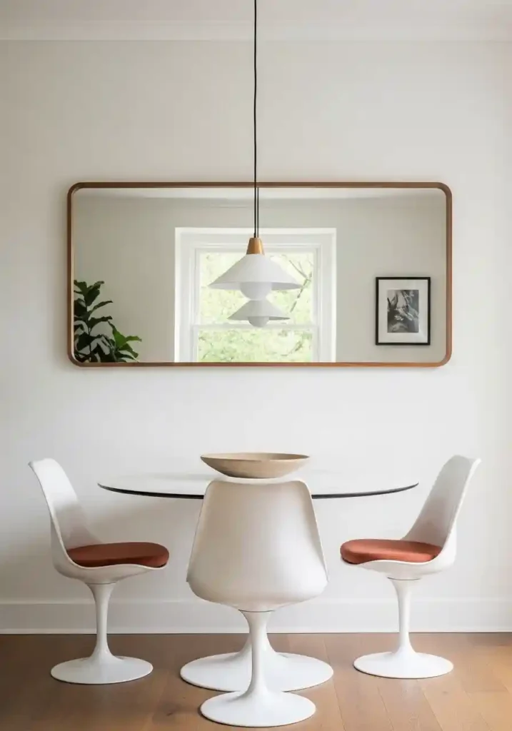 For maximum spatial expansion effect, choose a mirror that occupies approximately sixty to seventy percent of the wall surface rather than a cautiously small mirror that provides only a glimpse of reflection. Position the mirror to reflect the dining area’s best compositional angle — ideally a view that includes a window, natural light, or greenery that appears to bring the outside into the reflected view. A frameless mirror or one with a very slim profile creates the most architecturally seamless and most spatially effective spatial amplification.