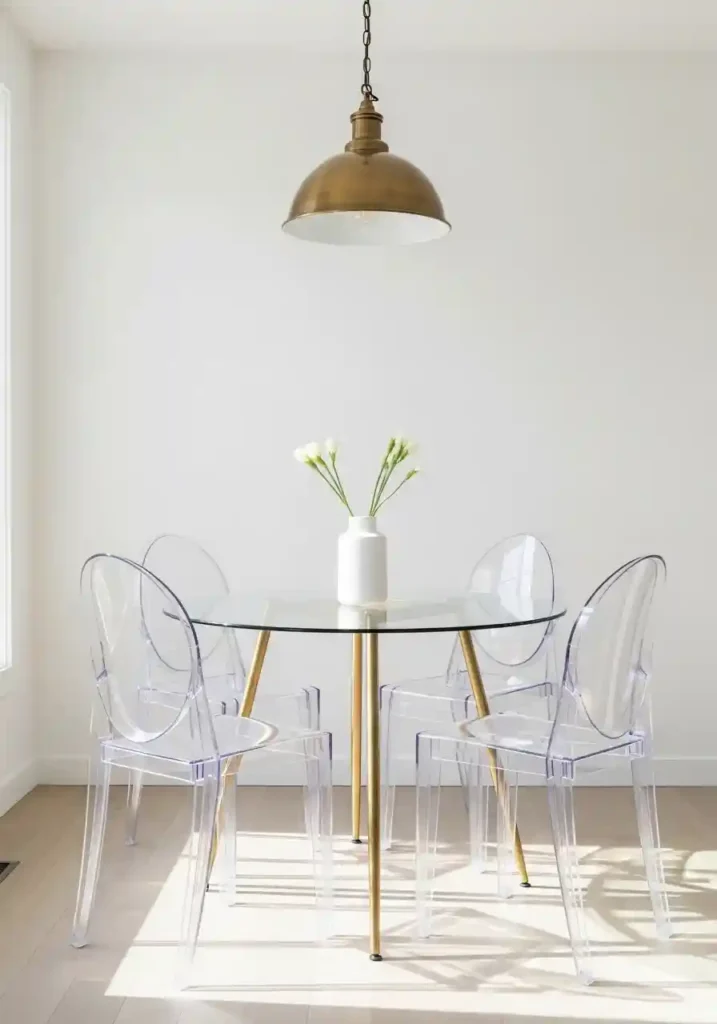 Glass-top tables and transparent acrylic chairs create more visual space in a small dining area than any other single furniture decision — the transparency of these materials allows the floor beneath them to remain visually continuous, making the dining furniture appear to barely occupy the floor it physically claims. Where an opaque solid-wood dining set of identical dimensions creates a visual mass the eye reads as heavy spatial occupation, transparent furniture allows light and sight lines to flow freely through the dining area, creating a significantly more open and more spacious feeling.