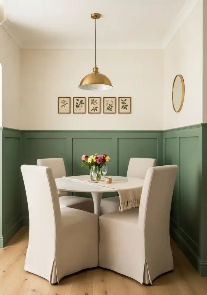 Choose two tones within the same color family for the most cohesive and most specifically beautiful result — a warm sage lower with a warm cream upper, a deep navy lower with a pale grey-blue upper, or a terracotta lower with a warm white upper creates the most intentional and most aesthetically resolved two-tone dining area. The color division line creates a natural position for a shelf, a picture rail, or a gallery arrangement that makes the transition between the two tones appear architecturally purposeful rather than arbitrary.