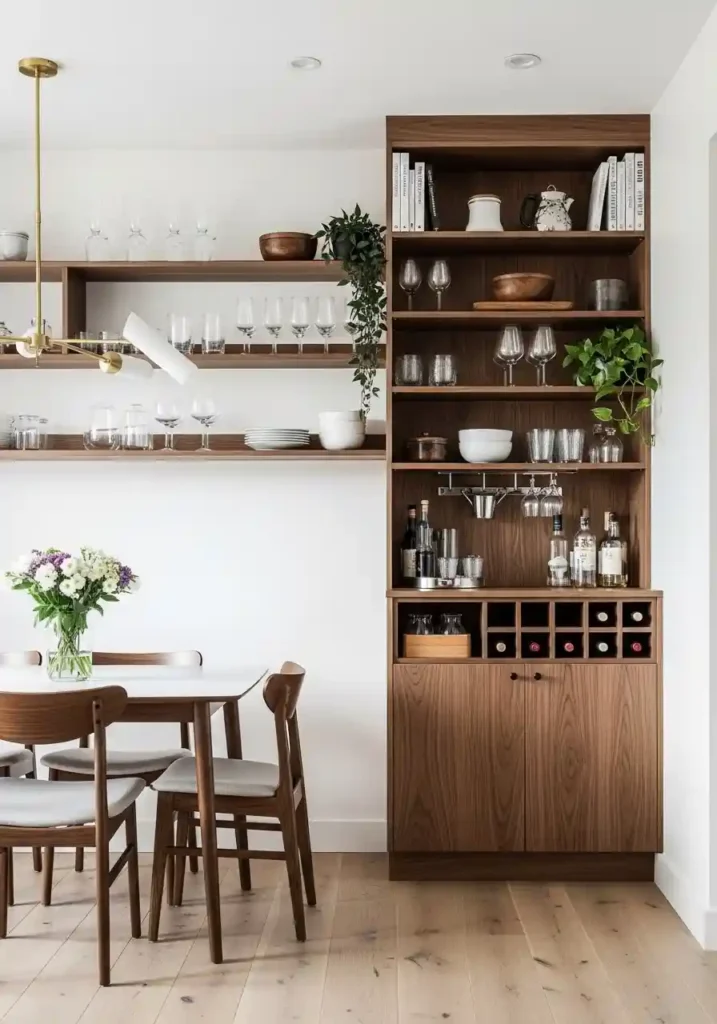 Floating shelves installed from table height to ceiling on the dining area’s primary wall transform an empty vertical surface into abundant storage and display capacity without consuming any floor space — a critical advantage in compact living where floor area is the most precious resource. The entire wall area above the visual horizon of the dining furniture is typically underutilized in most small dining areas, representing significant potential storage that floating shelves efficiently convert into organized, attractive, and functionally valuable wall-based storage.
