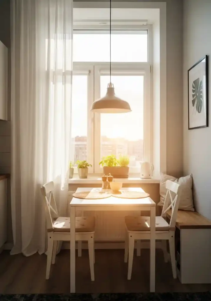 A window bench or built-in seat beneath the window paired with chairs on the room-facing side of the table creates the most light-maximizing and the most space-efficient window-adjacent dining setup — the bench takes significantly less depth than a pull-back chair, bringing the dining setup closer to the window wall and preserving more floor space between the dining table and the room’s center. Built-in window seating with storage underneath is the most spatially perfect expression of this strategy for compact living.