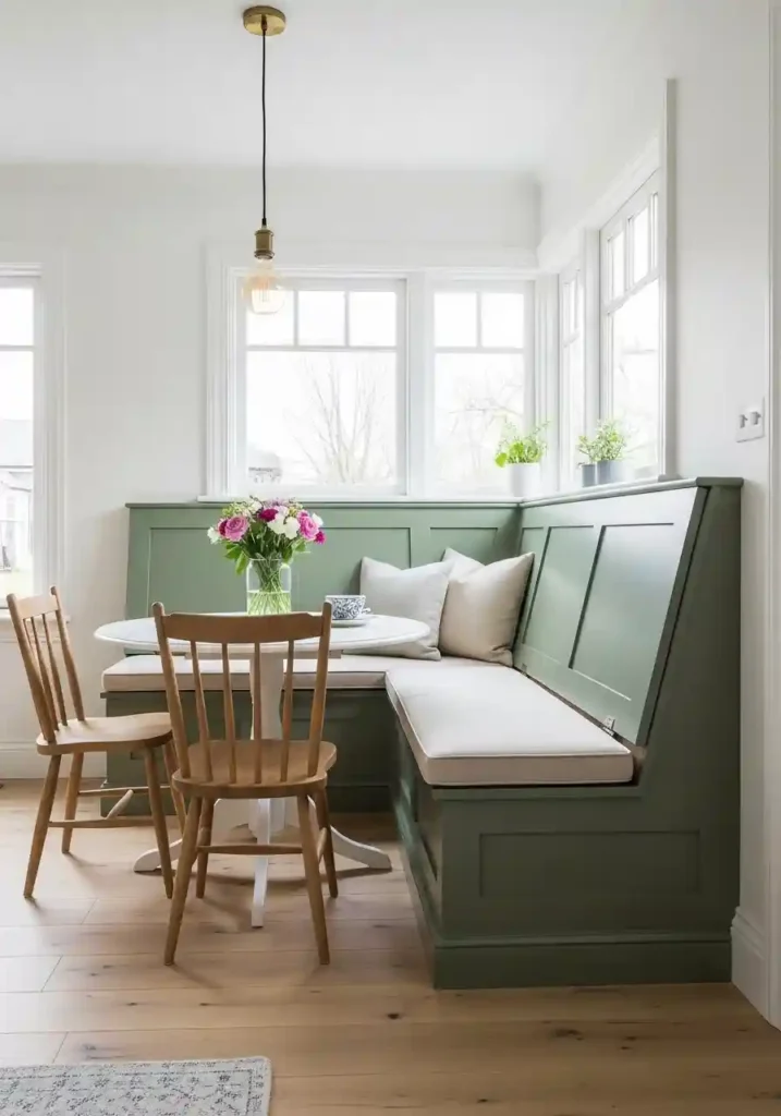 A built-in banquette window seat in a small dining corner creates spatial generosity through the elimination of chair clearance requirements on the banquette side of the table. Conventional chairs require a minimum of 60 centimeters behind the chair back for comfortable movement in and out of the seating position. A fixed banquette against the wall requires zero clearance behind it because diners slide along the fixed seat rather than pulling the chair in and out. This recovered 60 centimeters of floor clearance transforms a small dining space from genuinely cramped to comfortably functional without changing the room’s actual dimensions by a single millimeter.