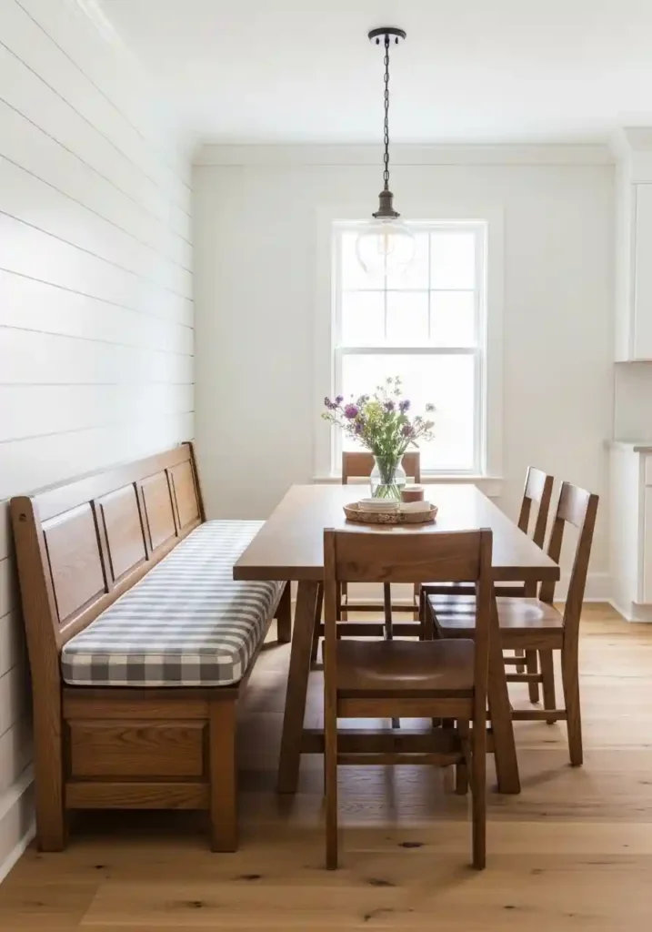 A fixed bench along the wall side of a small dining table is the most spatially efficient seating modification available without any construction work. A conventional dining chair requires approximately 60 centimeters of clear space behind it for comfortable movement in and out during seating. A fixed bench requires zero clearance behind it because the seating motion is a lateral slide rather than a backward pull. In a small dining room where that 60-centimeter strip of floor is the difference between comfortable function and genuine spatial difficulty, this single furniture substitution on one table side creates a meaningful and immediately perceptible improvement in the room’s usability and atmospheric comfort.