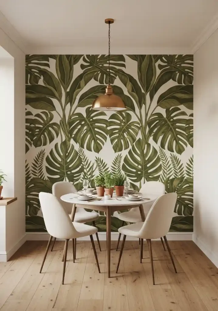 Large-scale botanical wallpaper on the main dining room wall creates a spatial illusion of remarkable effectiveness: the brain initially registers the large botanical motifs as plants in a garden visible through a window rather than a pattern on a wall surface, creating the perceptual experience of depth and outdoor space that genuinely expands the room’s apparent boundaries. This garden-window illusion is most powerful when the botanical pattern is genuinely large-scale — individual leaf forms approaching 40 to 60 centimeters in their longest dimension — because smaller botanical patterns read immediately as decorative surface treatment rather than spatial suggestion.
