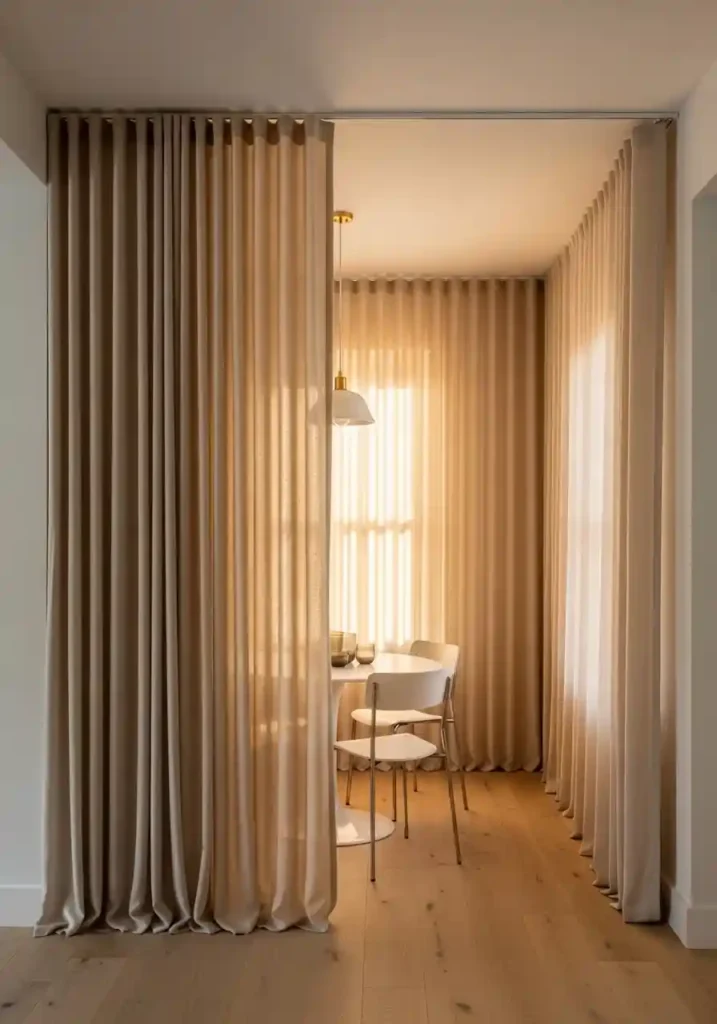 Hanging floor-to-ceiling curtains on a solid non-window wall creates one of the most consistently effective spatial illusion techniques available in small dining room decor by suggesting the presence of a generous window wall that does not actually exist. The tall vertical sweep of fabric from ceiling to floor amplifies perceived ceiling height, making the room feel taller and therefore more spacious. The implied promise of windows behind the curtains creates a visual curiosity that makes the room feel more interesting and more open than its actual envelope provides. This is architectural deception at its most elegant and its most affordable.