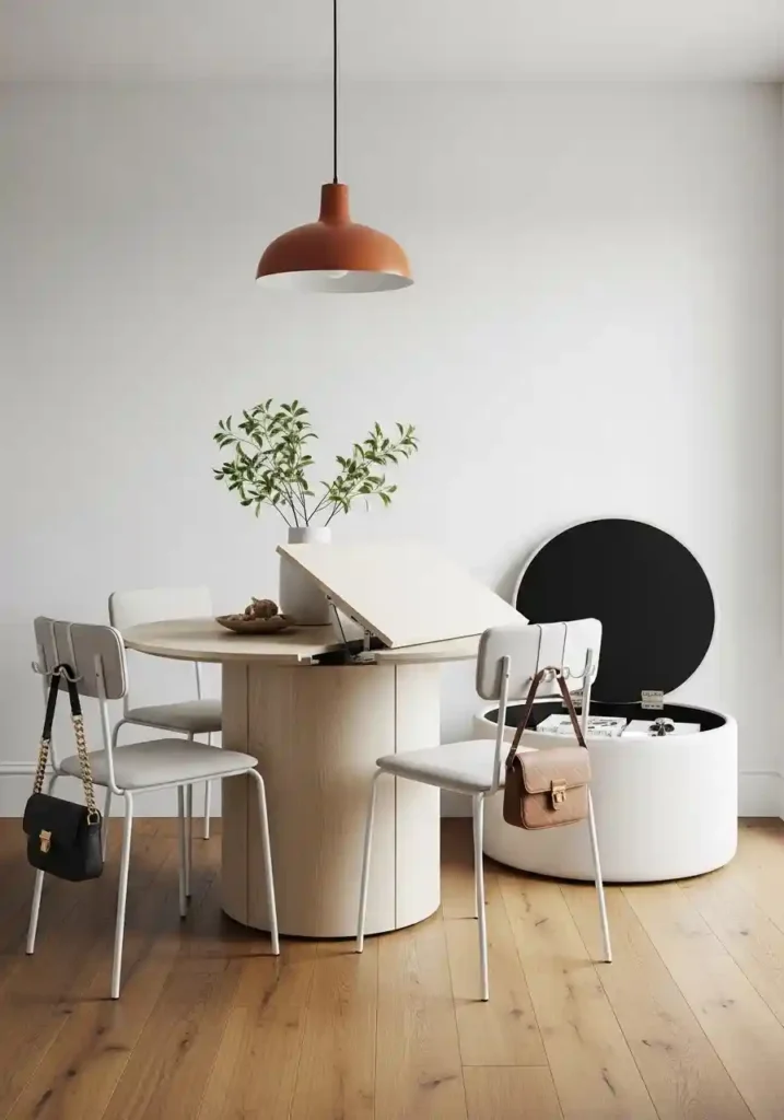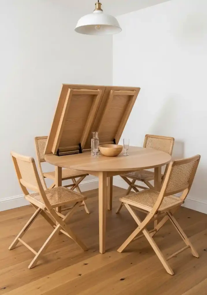 The specific advantage of a round drop-leaf table over a rectangular one is the absence of sharp corners in either configuration, creating a softer spatial profile that reads as less imposing in limited floor area. Pair it with four lightweight rattan or folding chairs that can be leaned flat against an adjacent wall or stored in a nearby cupboard when not in use. The floor beneath and around the collapsed table becomes available space for movement, alternative activities, or simply the visual openness that makes a small room feel genuinely comfortable rather than permanently and inflexibly dedicated to dining regardless of whether any dining is occurring.