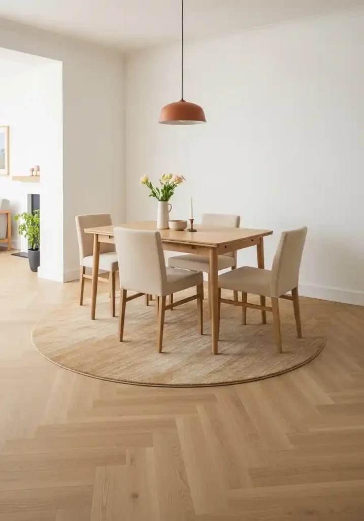 The area rug beneath the dining table performs the zone-definition function that floor material changes would otherwise attempt, without the visual limitation that a floor material boundary creates. A round rug in a warm neutral tone positions the dining zone clearly within the open plan while the continuous floor running around and beneath it maintains the full open-plan spatial perception. This flooring continuity principle is the single most important spatial intelligence insight for open-plan dining room design and the one most frequently overlooked in otherwise thoughtful small space interior design decisions.