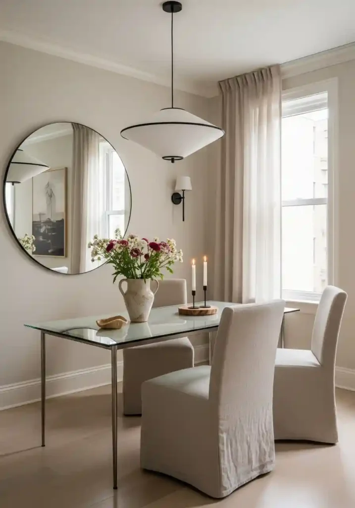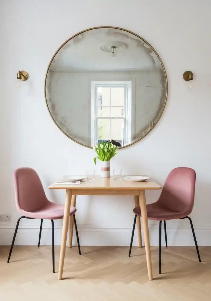 A large round mirror mounted on the main wall behind the dining table is the single most impactful spatial illusion technique available in small dining room decor. The reflected image creates the perceptual experience of doubled room depth from every seated position, making the compact space read as significantly more generous than its actual dimensions provide. When the mirror reflects a window and its natural light, it also effectively doubles the room’s apparent brightness, addressing two of the most persistent small dining room challenges — limited depth and limited light — with a single installation. This is the highest spatial-return investment available in small dining room improvement.