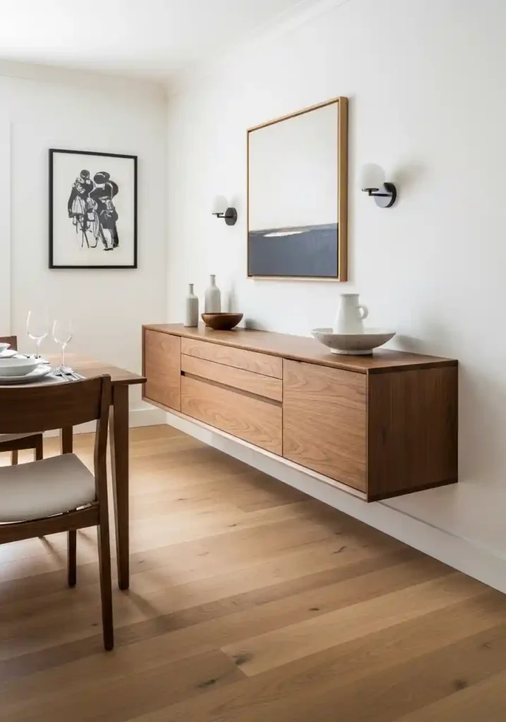 A wall-mounted floating sideboard at 22 to 25 centimeters depth provides all the serving surface and display area that a small dining room requires while contributing zero floor obstruction to the limited available space. The visible floor beneath the floating unit creates the perception of an uninterrupted floor plane that makes the room appear wider and more generously dimensioned than it actually measures. Every square centimeter of clear floor visible beneath any wall-mounted furniture piece contributes to the perceived spatial generosity that small dining rooms depend on achieving through intelligent furniture selection rather than physical dimension.