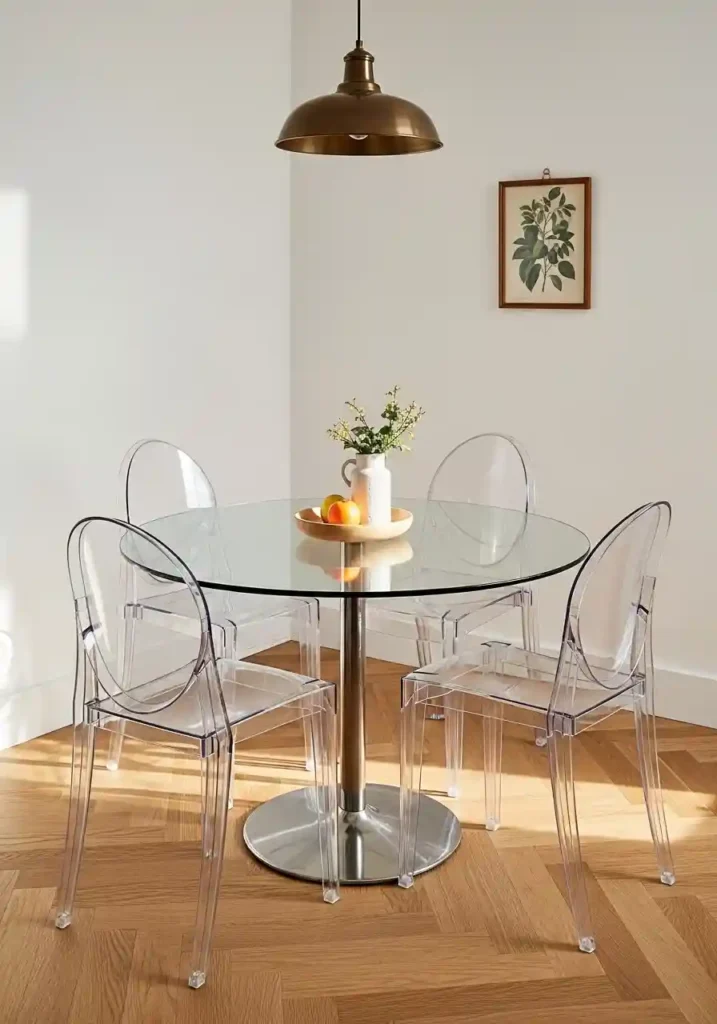Pairing the glass table with transparent acrylic ghost chairs amplifies the spatial effect dramatically. When both the table and the chairs become essentially invisible as furniture forms, the room’s architectural qualities — the flooring, the walls, the overhead lighting, the window — become the primary visual experience rather than the furniture. The result is a small dining room that feels architecturally considered and spatially generous rather than furniture-crowded and proportionally challenged. Maintain the transparent furniture quality by keeping the glass table surface impeccably clean and choosing ghost chairs from established manufacturers whose higher-quality acrylic maintains genuine optical clarity.