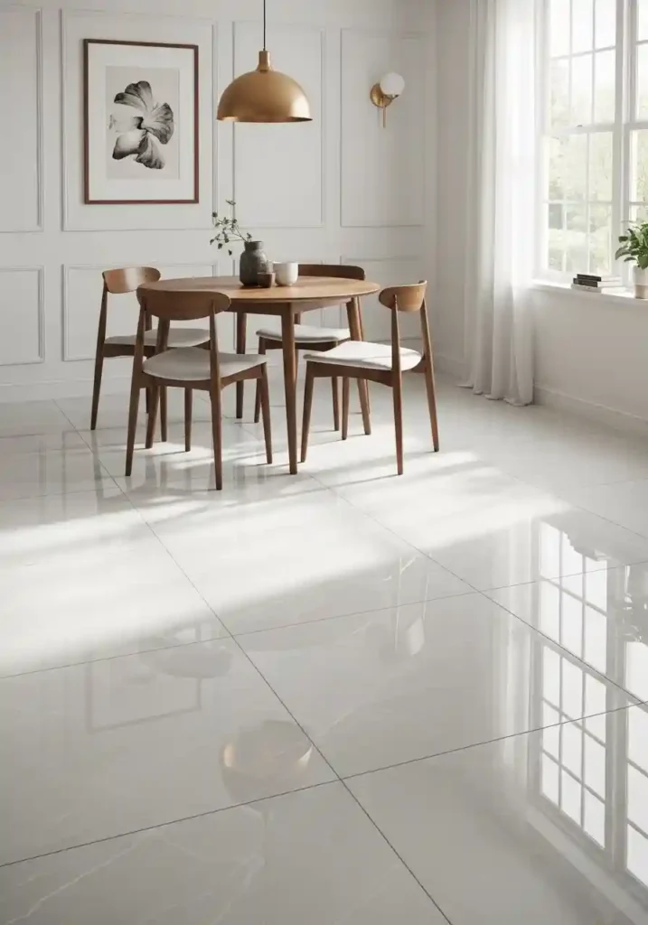 Pale, large-format floor tiles with a polished or semi-polished finish create two simultaneous spatial expansion effects in a small dining room: the pale tone reflects natural light across the floor surface instead of absorbing it, dramatically increasing the room’s apparent luminosity; and the large tile format creates fewer visible grout lines, making the floor appear as a continuous, uninterrupted surface rather than a grid of smaller units that would emphasize the room’s limited dimensions. These combined effects create a floor that appears to expand visually beyond its actual area in every direction from every viewing position.