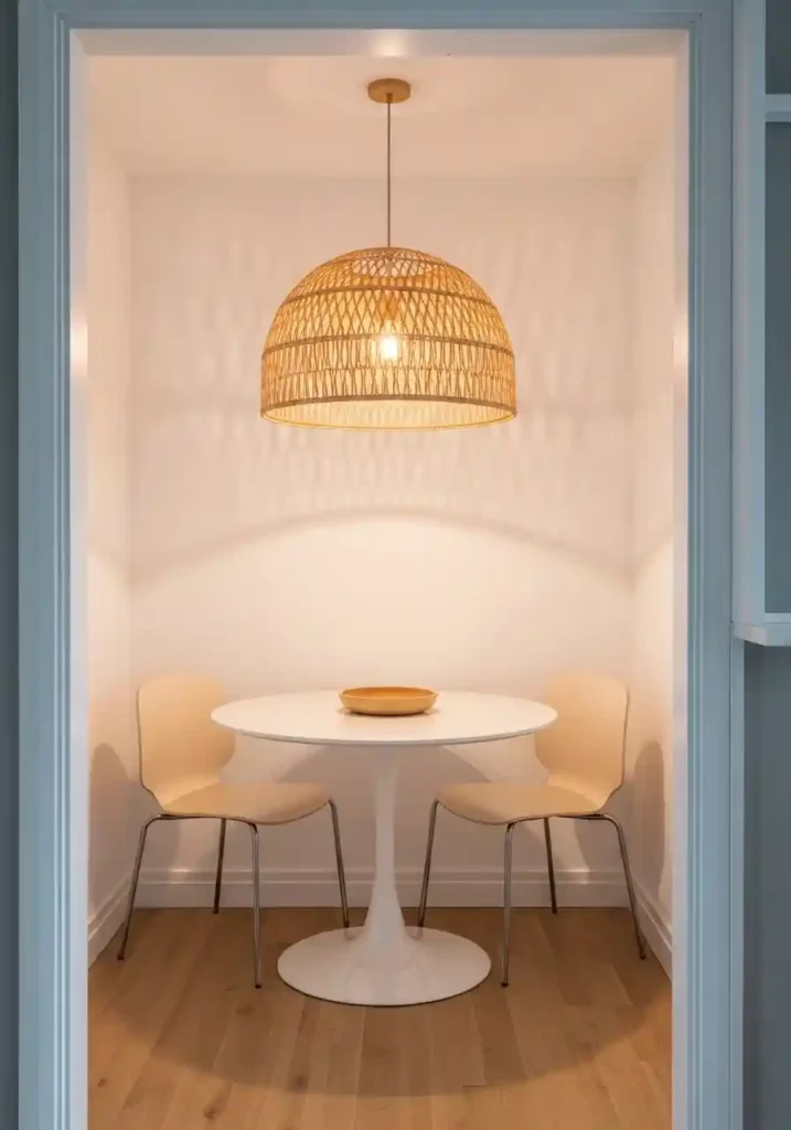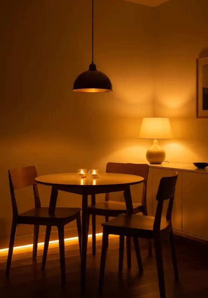 Install all light sources on dimmer circuits to allow complete control of the atmospheric balance between different sources throughout different times of day. In the morning, the pendant can be bright and the table candles unlit. In the evening, the pendant can be low, the sideboard lamp warm, and the candles creating the intimate table-level warmth that makes every dinner feel genuinely special. This flexibility transforms the same small room into genuinely different atmospheric experiences across different occasions without any physical change to the space itself, which is the most efficient spatial investment available.