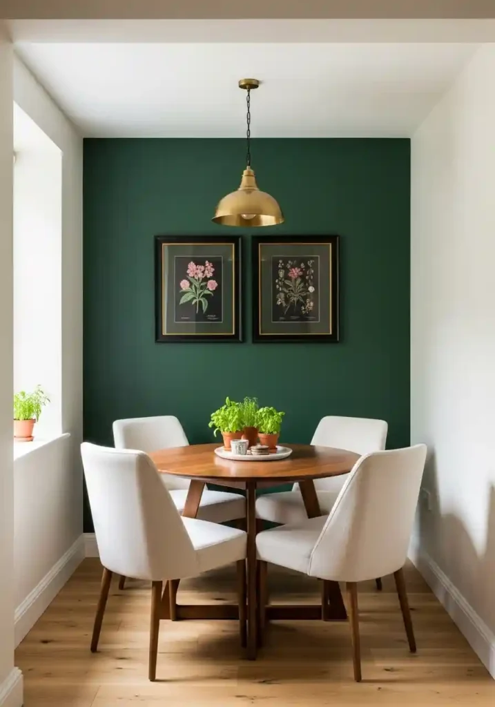 A single deeply saturated feature wall behind the dining table creates spatial depth through atmospheric perspective — the darker wall appears to recede visually, making the distance between the dining table and the rear wall feel greater than the actual measurement. This spatial illusion is directly related to the atmospheric perspective principle used by landscape painters to create depth on a flat canvas: darker, more saturated tones appear to recede while lighter tones appear to advance. Applied to a small dining room’s rear wall, a deep forest green, midnight navy, or rich charcoal creates the perception of additional depth that increases the room’s apparent scale.