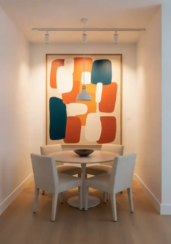 Gallery-quality picture rail lighting directed at the artwork creates the specific illumination quality that transforms wall-hung art from decoration to genuine architectural feature. When an artwork is lit with warm directional spotlights that make it appear to glow from within, it becomes the defining experience of the room rather than a detail within it, shifting the dining room’s perceived identity from small functional space to personal art environment with a dining area. This shift in perceived identity is the most profound spatial transformation available because it changes what the room feels like before the eye has registered what it measures.