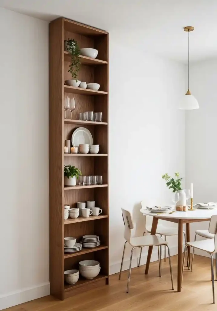 A floor-to-ceiling vertical storage tower in a small dining room simultaneously solves three persistent compact space problems: insufficient storage, visual clutter from objects without dedicated homes, and low perceived ceiling height. The tower’s height draws the eye dramatically upward, creating the same perceived ceiling amplification effect as floor-to-ceiling curtains but through solid material and genuine organizational function. When the eye follows the vertical tower from floor to ceiling, the brain registers the room as taller than a horizontal scan of the space would suggest, making the overall proportional experience of the room feel genuinely more generous.